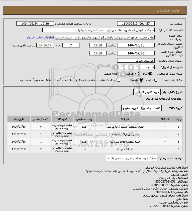 نام دستگاه خریدار:شرکت پالایش گاز شهید هاشمی نژاد استان خراسان رضوی