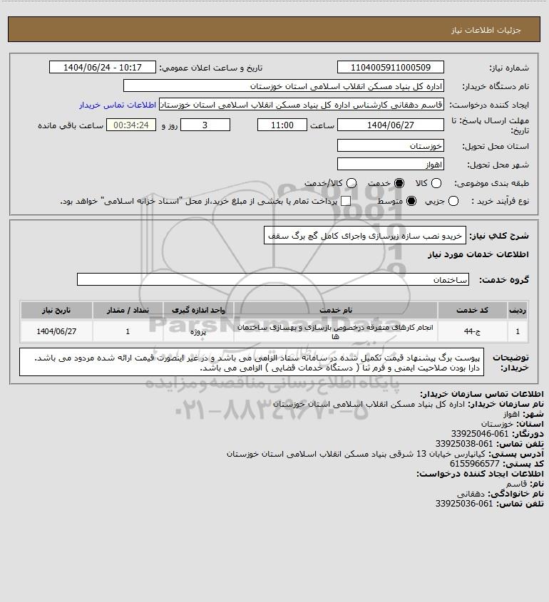 شرح کلی نیاز: خریدو نصب سازه زیرسازی واجرای کامل گچ برگ سقف