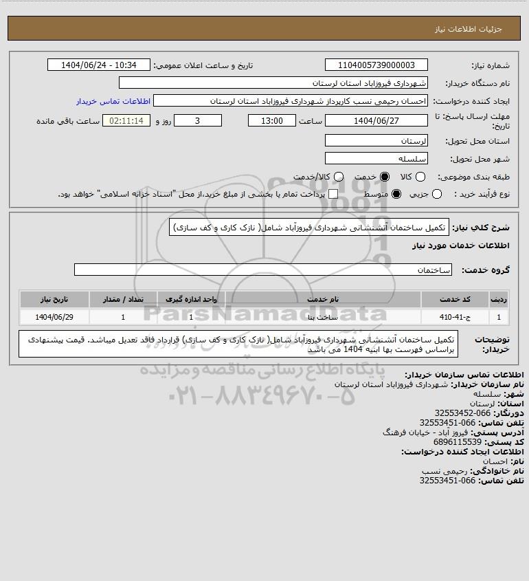 شرح کلی نیاز: تکمیل ساختمان آتشنشانی شهرداری فیروزآباد شامل( نازک کاری و کف سازی)