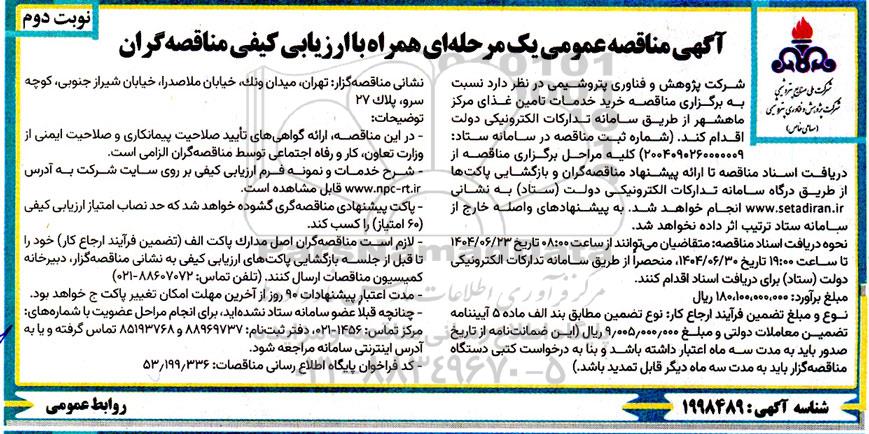 شرکت پژوهش و فناوری پتروشیمی در نظر دارد نسبت به برگزاری مناقصه خرید خدمات تامین غذای مرکز ماهشهر از طریق سامانه تدارکات الکترونيکي دولت اقدام کند. شماره ثبت مناقصه در سامانه ستاد 2004090260000009 کلیه مراحل برگزاری مناقصه از دریافت اسناد مناقصه تا ارائه پیشنهاد مناقصه گران و بازگشایی پاکتها از طریق درگاه سامانه تدارکات الکترونیکی دولت (ستاد) به آدرس ستاد ایران انجام خواهد شد به پیشنهادهای واصله خارج از سامانه ستاد ترتیب اثر داده نخواهد شد.