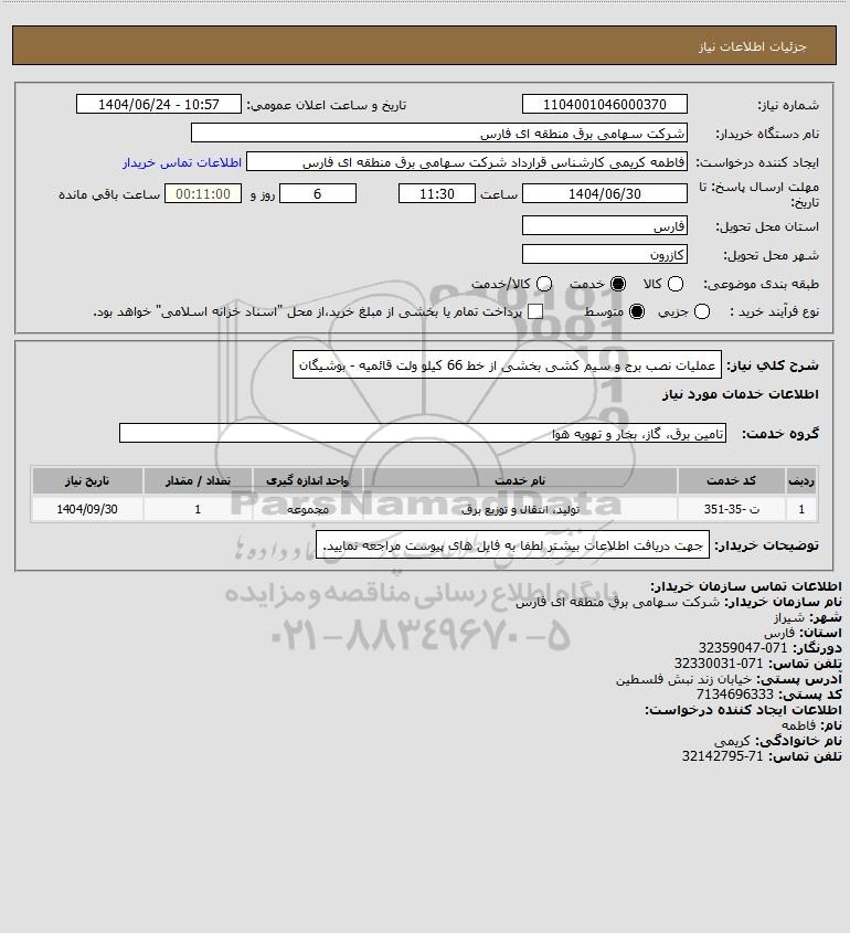 شرح کلی نیاز: عملیات نصب برج و سیم کشی بخشی از خط 66 کیلو ولت قائمیه - بوشیگان
