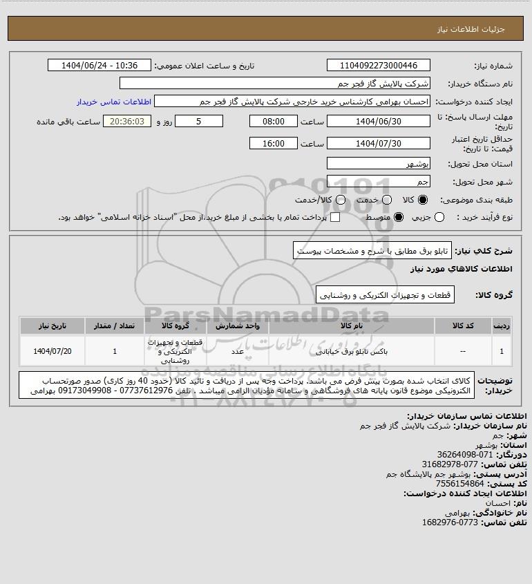شرح کلی نیاز: تابلو برق مطابق با شرح و مشخصات پیوست