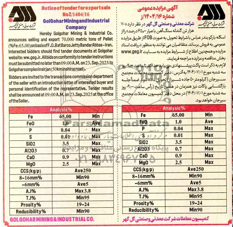 شرکت معدنی و صنعتی گل گهر در نظر دارد 70 هزار تن گندله سنگ آهن با عیار 65.00 درصد را از اسکله بارکو بندرعباس با شرایط تحویل به صورت FOB از طریق مزایده عمومی به فروش برساند. متقاضیان می توانند به منظور دریافت اسناد مزایده و همچنین اطلاع از شرایط مزایده به سایت WWW.GEG.IR بخش مناقصه و مزایده مراجعه نمایند. لازم به ذکر است پاکت پیشنهادی می باید حداکثر تا ساعت 9 روز سه شنبه مورخ 1404.07.01 به آدرس دفتر کمیسیون معاملات مجتمع سیرجان (کیلومتر 50 جاده شیراز) تحویل داده شود . ضمنا جلسه بازگشایی پاکات نیز در همین تاریخ (راس ساعت 9 روز سه شنبه مورخ 1404.07.01) و در محل دفتر کمیسیون معاملات مجتمع سیرجان می باشد.
