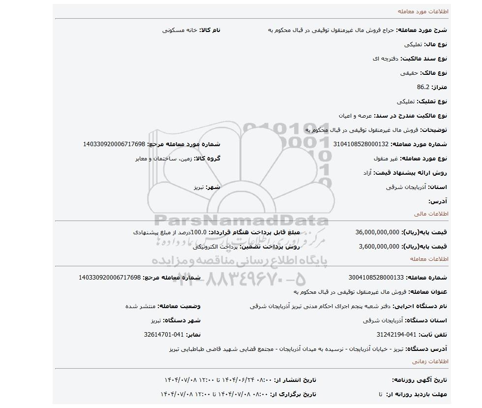 9 مزایده دستور فروش ملک مشاعی 9810687 1404/08/15 new not special not payed آذربایجان شرقی