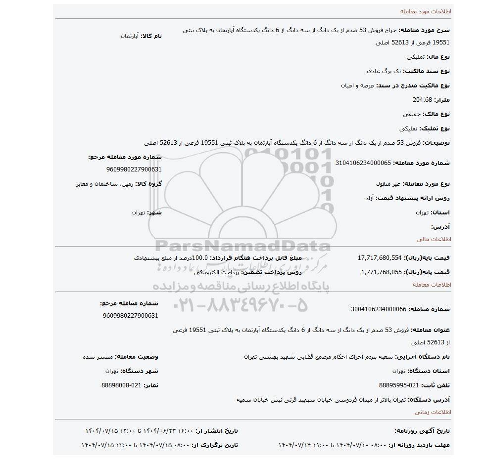مزایده، فروش 53 صدم از یک دانگ از سه دانگ از 6 دانگ یکدستگاه آپارتمان به پلاک ثبتی 19551 فرعی از 52613 اصلی