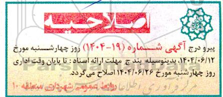 پیرو درج آگهی شماره (19-1404) روز چهارشنبه مورخ 1404.6.12 ، بدینوسیله بند ج مهلت ارائه اسناد تا پایان وقت اداری روز چهارشنبه مورخ 1404.6.26 اصلاح میگردد.