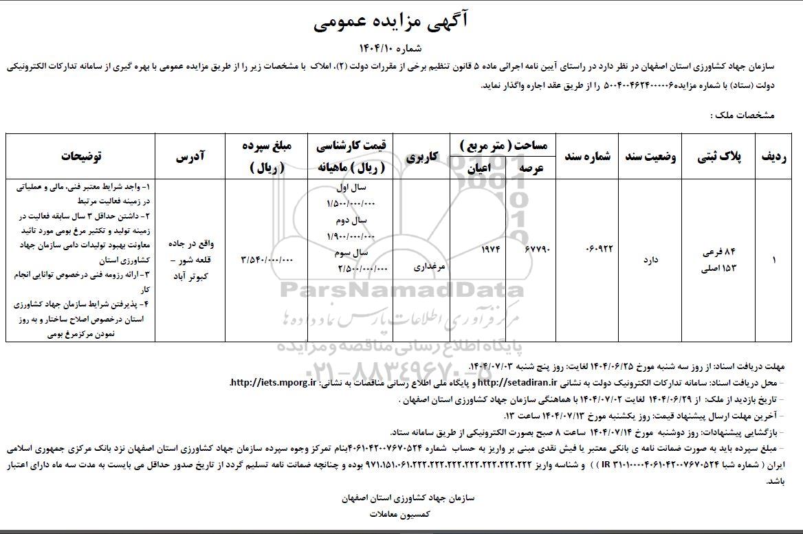 سازمان جهاد کشاورزی استان اصفهان در نظر دارد در راستای آیین نامه اجرایی ماده 5 قانون تنظیم برخی از مقررات دولت (2)، املاک با مشخصات زیر را از طریق مزایده عمومی با بهره گیری از سامانه تدارکات الکترونیکی دولت (ستاد) به شماره مزایده 5004004624000006 را از طریق عقد اجاره واگذار نماید.