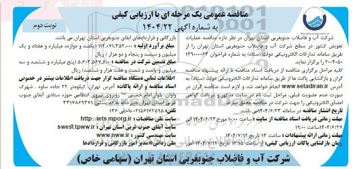 آگهی مناقصه عمومی یک مرحله ای با ارزیابی کیفی به شماره آگهی 1404.22 ؟ نوبت دوم