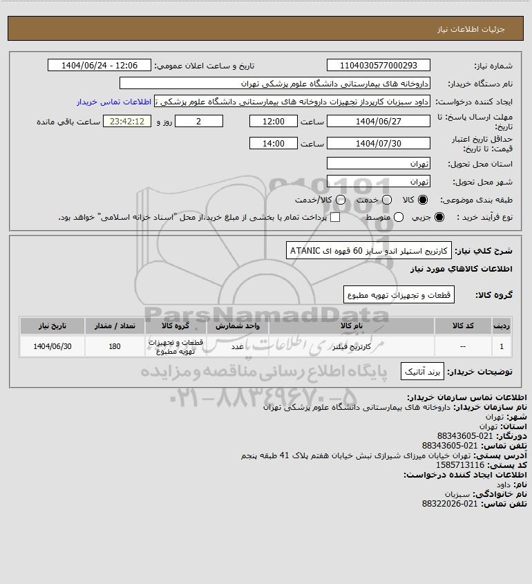 | 1 | -- | کارتریج فیلتر | عدد | قطعات و تجهیزات تهویه مطبوع | 180 | 1404/06/30 |