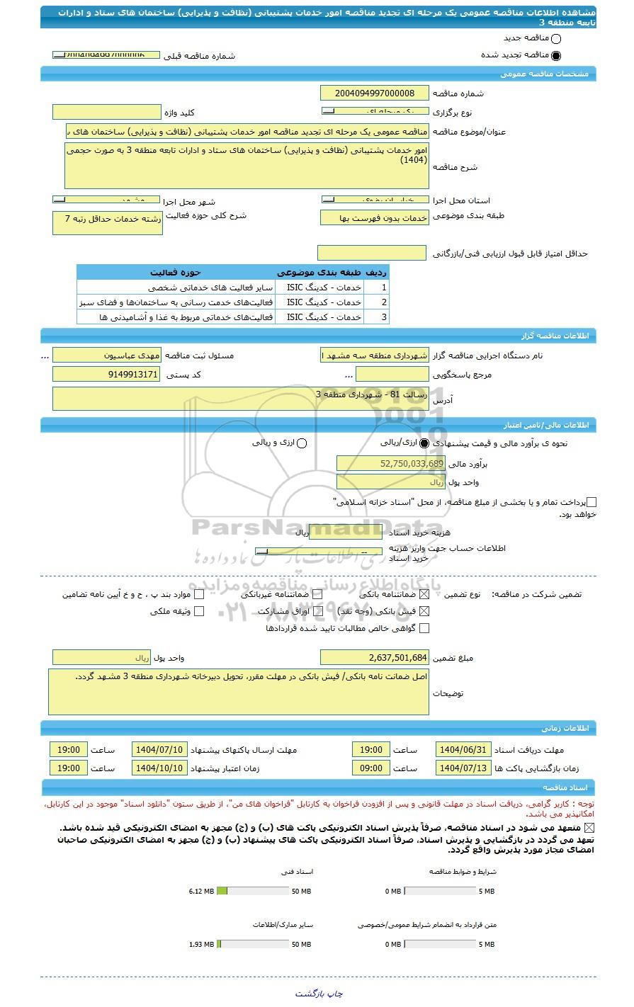 | نام دستگاه اجرایی مناقصه گزار | شهرداری منطقه سه مشهد استان خراسان رضوی | مسئول ثبت مناقصه | مهدی عباسیون |
