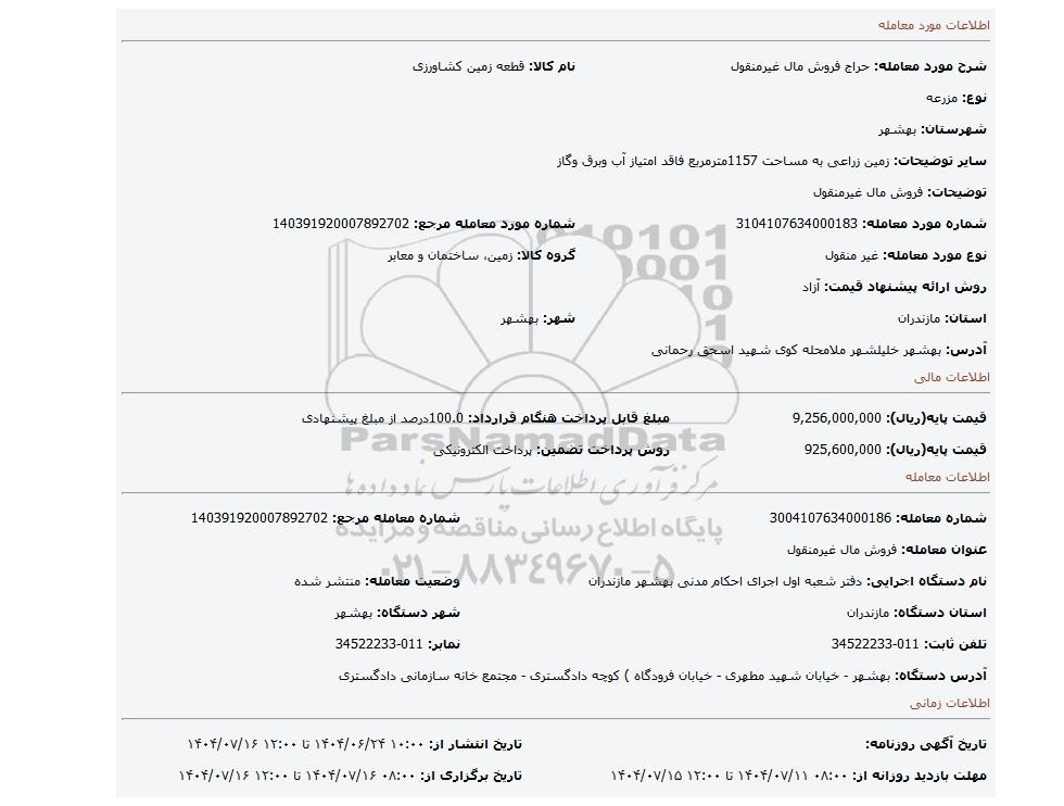| شرح مورد معامله: حراج فروش مال غیرمنقول | نام کالا: قطعه زمین کشاورزی | |