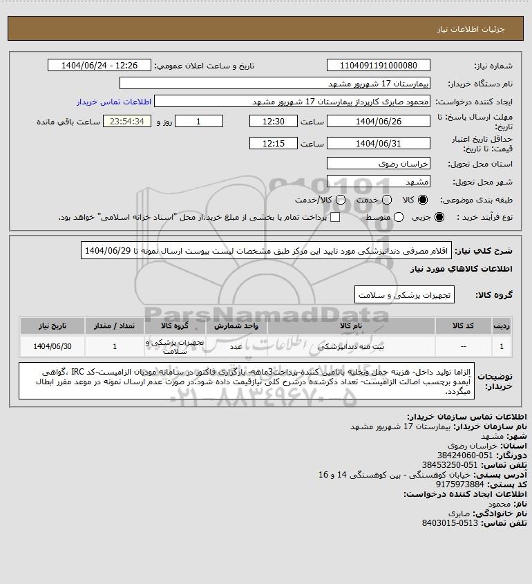 شرح کلی نیاز: اقلام مصرفی دندانپزشکی مورد تایید این مرکز طبق مشخصات لیست پیوست ارسال نمونه تا 1404/06/29