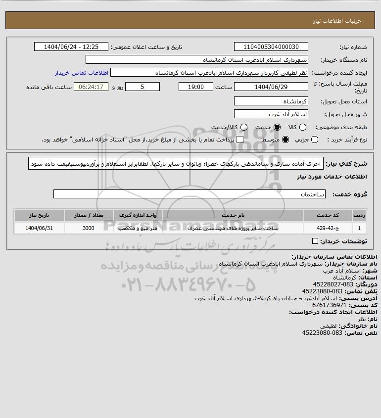 شرح کلی نیاز: اجرای آماده سازی و ساماندهی پارکهای خضراء وبانوان و سایر پارکها. لطفابرابر استعلام و برآوردپیوستیقیمت داده شود