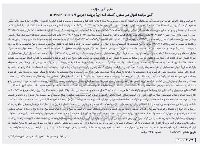 مزایده فروش ششدانگ یک قطعه آپارتمان مسکونی به شماره پلاک چهار هزار و ششصد و بیست و هفت فرعی از اصلی 109