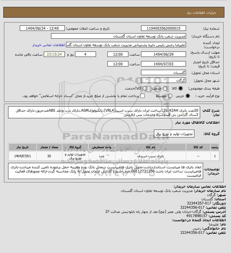 | 1 | -- | باتری سرب اسیدی | عدد | تجهیزات تولید و توزیع برق | 20 | 1404/07/01 |