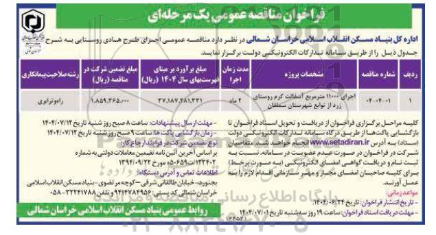 اداره کل بنیاد مسکن انقلاب اسلامی خراسان شمالی در نظر دارد مناقصه عمومی اجرای طرح هادی روستایی به شرح جدول ذیل از طریق سامانه تدارکات الکترونیکی دولت برگزار نماید.