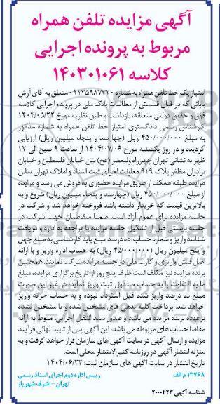 موضوع مزایده : یک خط تلفن همراه به شماره 09125987320 به ارزش 450.000.000 ریال