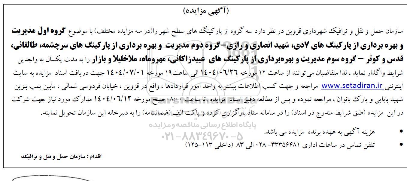 سازمان حمل و نقل و ترافیک شهرداری قزوین در نظر دارد سه گروه از پارکینگ های سطح شهر را در سه مزایده مختلف با موضوع گروه اول مدیریت و بهره برداری از پارکینگهای 7 دی ، شهید انصاری و رازی - گروه دوم مدیریت و بهره برداری از پارکینگ های سرچشمه ، طالقانی ، قدس و کوثر - گروه سوم مدیریت و بهره برداری از پارکینگ های عبید زاکانی ، مهروماه ، ملاخلیلا و بازار را به مدت یکسال به واجدین شرایط واگذار نماید ، لذا متقاضیان میتوانند از ساعت 12 مورخه 1404.6.26 الى ساعت 19 مورخه 1404.7.1 جهت دریافت اسناد مزایده به سایت اینترنتی ستاد ایران مراجعه و جهت کسب اطلاعات بیشتر به واحد امور قراردادها ، واقع در قزوین ، خیابان فردوسی شمالی ، مابین پمپ بنزین شهید بابایی و پارک بانوان ، مراجعه نموده و پس از مطالعه دقیق اسناد مزایده ، تا ساعت 8 صبح مورخه 1404.6.12 مدارک مورد نیاز جهت شرکت در این مزایده طبق شرایط مندرج در اسناد را در سامانه ستاد بارگزاری کرده و پاکت الف (ضمانتنامه) را به دبیرخانه این سازمان تحویل نمایند.