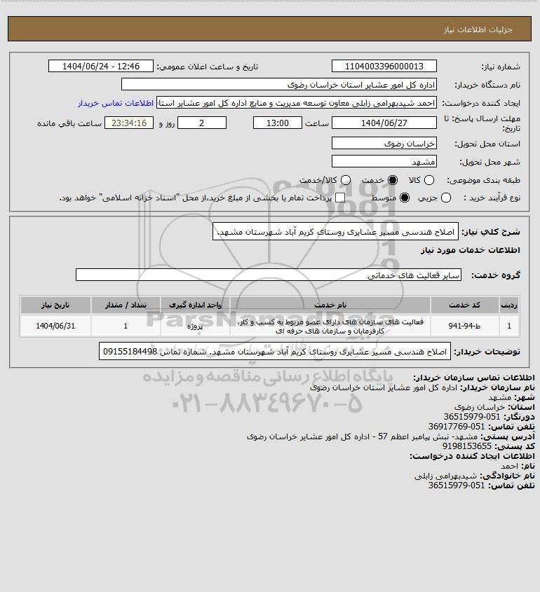 شرح کلی نیاز: اصلاح هندسی مسیر عشایری روستای کریم آباد شهرستان مشهد.