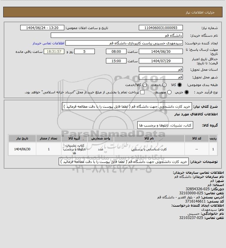 شرح کلی نیاز: خرید کارت دانشجویی جهت دانشگاه قم ( لطفا فایل پیوست را با دقت مطالعه فرمائید )