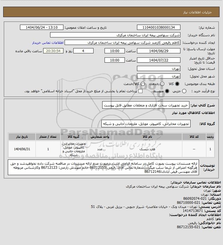 | 1 | -- | هارد دیسک | عدد | تجهیزات مخابراتی، کامپیوتر، موبایل، ملزومات جانبی و شبکه | 1 | 1404/06/31 |