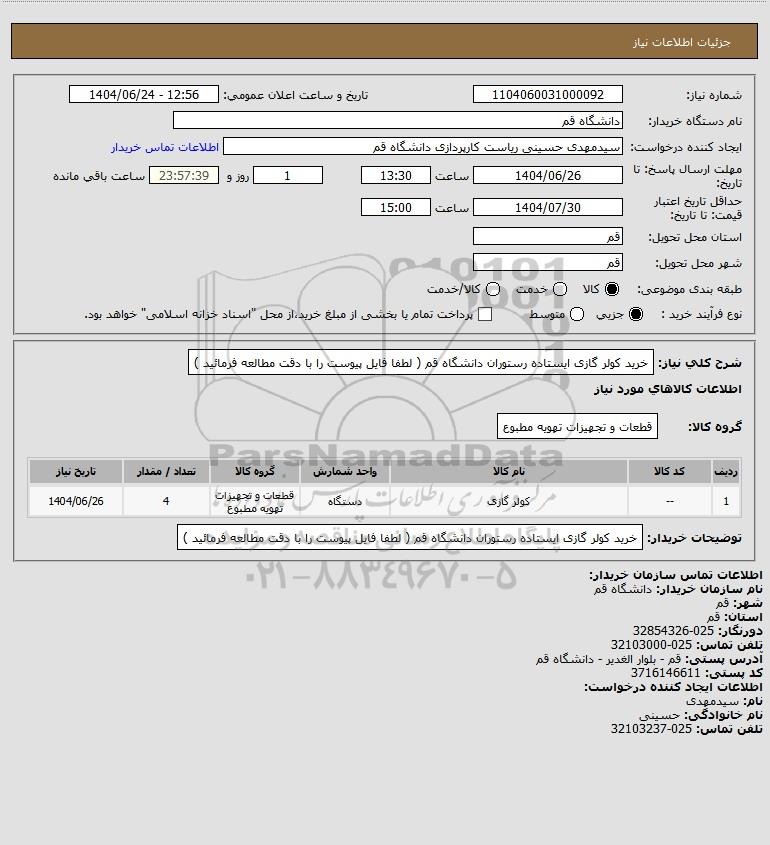 شرح کلی نیاز: خرید کولر گازی ایستاده رستوران دانشگاه قم ( لطفا فایل پیوست را با دقت مطالعه فرمائید )