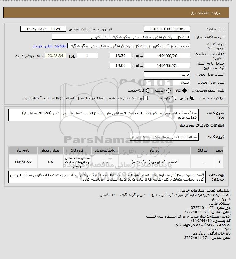 شرح کلی نیاز: سنگ سفید اتابک مرغوب فیروزآباد به ضخامت 4 سانتی متر و ارتفاع 80 سانتیمتر با عرض متغیر (50تا 70 سانتیمتر) 125متر مربع