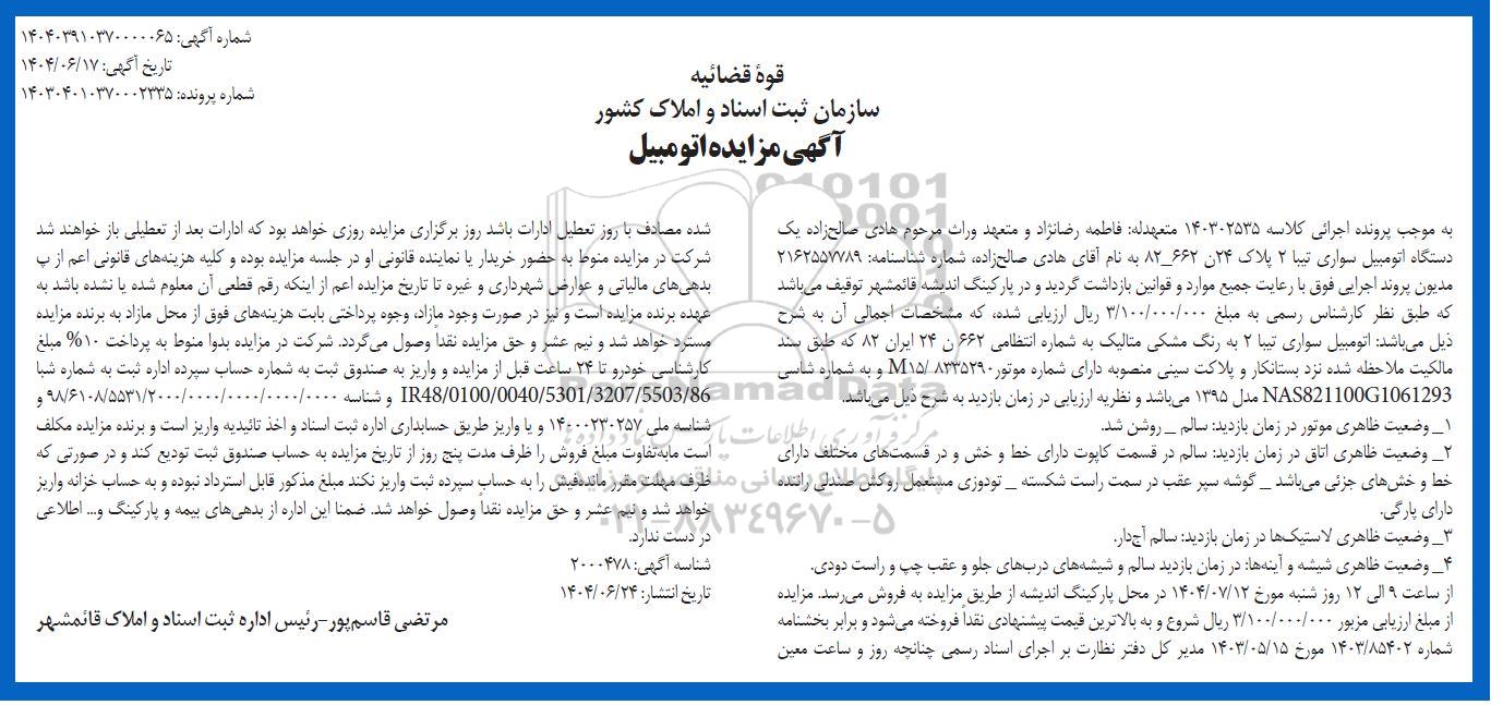 مزایده فروش یکدستگاه اتومبیل سواری تیبا 2 مدل 1395 به مبلغ 3.100.000.000 ریال