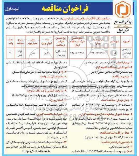بنیاد مسکن انقلاب اسلامی استان اردبیل در نظر دارد اجرای دیوار چینی 40 واحد از 60 واحدی نهضت ملی مسکن شهرستان نیر (بلوک چینی با وال پست و میلگرد بستر بصورت با مصالح) بشرح جدول ذیل و بر اساس مشخصات فنی منقسم به اسناد مناقصه را از طریق برگزاری مناقصه عمومی یک مرحله ای به مناقصه گران واجد شرایط واگذار نماید.
