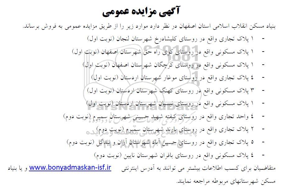 بنیاد مسکن انقلاب اسلامی استان اصفهان در نظر دارد موارد زیر را از طریق مزایده عمومی به فروش برساند.