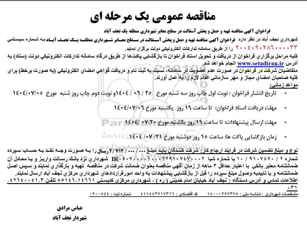 فراخوان آگهی مناقصه تهیه و حمل و پخش آسفالت در سطح معابر شهرداری منطقه یک نجف آباد