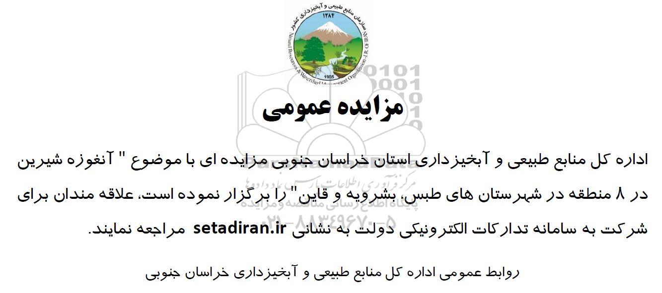 اداره کل منابع طبیعی و آبخیزداری استان خراسان جنوبی مزایده ای با موضوع آنغوزه شیرین در 8 منطقه در شهرستانهای طبس بشرویه و قاین را برگزار نموده است علاقه مندان برای شرکت به سامانه تدارکات الکترونیکی دولت به نشانی سایت ستاد ایران مراجعه نمایند.