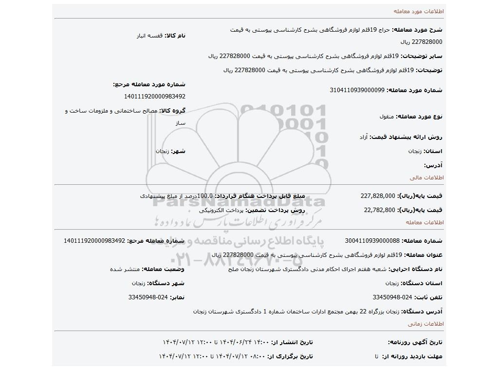 | نام دستگاه اجرایی: شعبه هفتم اجرای احکام مدنی دادگستری شهرستان زنجان صلح | وضعیت معامله: منتشر شده | |