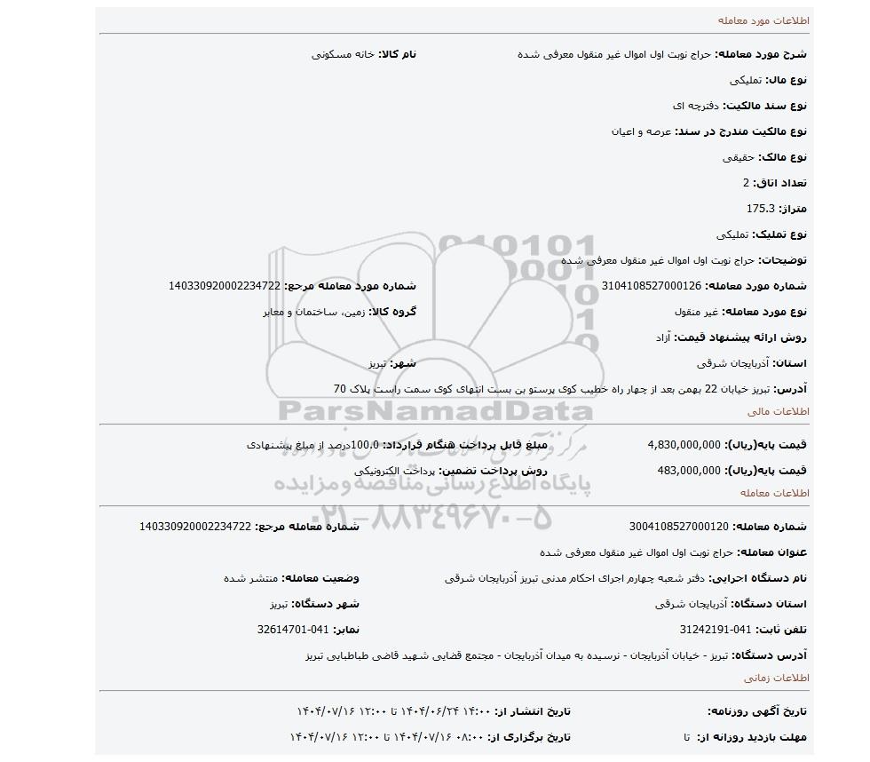 | عنوان معامله: حراج نوبت اول اموال غیر منقول معرفی شده | ||