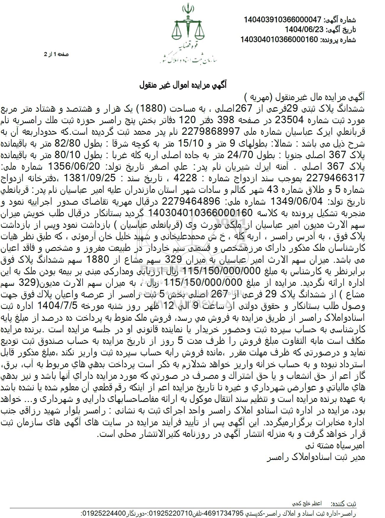 مزایده فروش ششدانگ پلاک ثبتی 29 فرعی از 267 اصلی به مبلغ 115.150.000.000 ریال