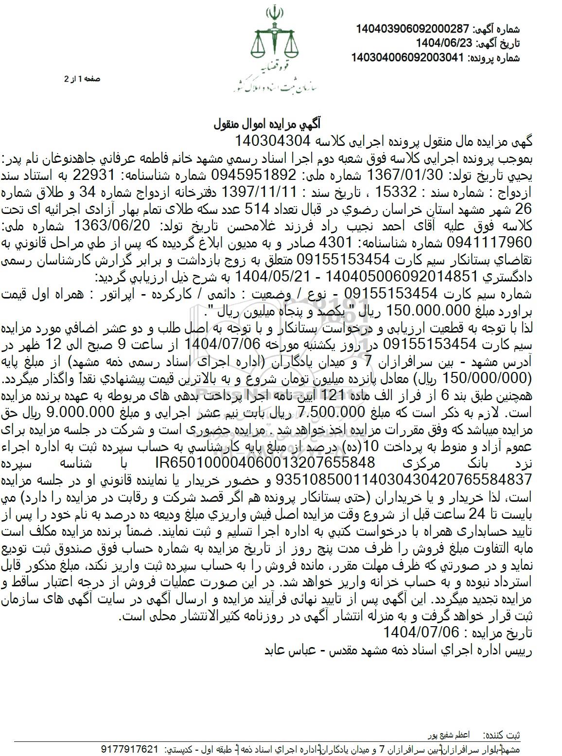 اداره اجرای اسناد ذمه مشهد مقدس