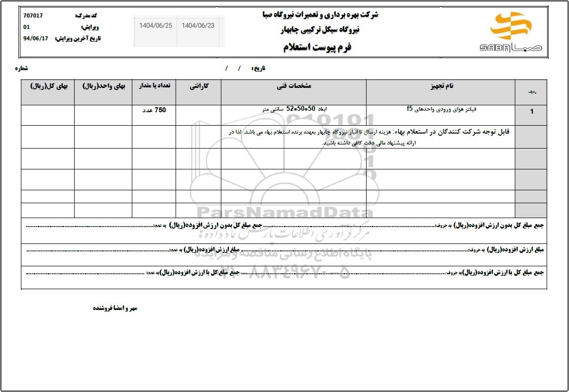 استعلام بها و موضوع استعلام استعلام فیلتر هوای ورودی واحدهای f5 به اطلاع کلیه شرکتها و افراد متخصص واجد شرایط میرساند، آگهی گذار در نظر دارد از طریق استعلام بها، نسبت به انتخاب و دریافت پیشنهادات اقدام نماید. این استعلام با کد آگهی ثبت شده در سامانه خبرگزاری پارس نماد : 9551551 منتشر شده است. مشخصات استعلام : تاریخ شروع استعلام: 1404/06/24 آخرین مهلت ارسال پیشنهاد قیمت : 1404/06/25 و محل اجرای پروژه : استان سیستان و بلوچستان میباشد. استعلام قیمت مورد درخواست : استعلام فیلتر هوای ورودی واحدهای f5 با دستهبندیهای تخصصی و گروه های مرتبط : انواع فیلتر های تصفیه, نیروگاه, تجهیزات برق و الکترونیک, استعلام اطلاع رسانی میگردد. شرایط شرکت در استعلام آنلاین : ابتدا ثبت نام در سامانه استعلام پارس نماد و تکمیل مدارک موردنیاز و بارگذاری در سامانه رعایت تمامی ضوابط و الزامات مندرج در اسناد استعلام است.