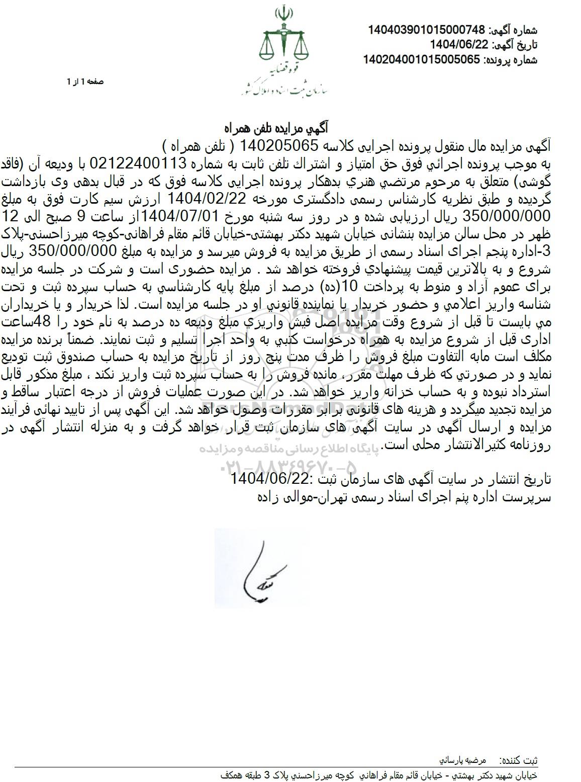 مزایده فروش حق امتیاز و اشتراک تلفن ثابت به شماره 02122400113