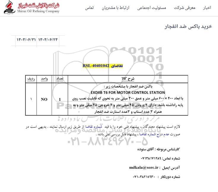 استعلام بها و موضوع استعلام استعلام خرید باکس ضد انفجار به اطلاع کلیه شرکتها و افراد متخصص واجد شرایط میرساند، آگهی گذار در نظر دارد از طریق استعلام بها، نسبت به انتخاب و دریافت پیشنهادات اقدام نماید. این استعلام با کد آگهی ثبت شده در سامانه خبرگزاری پارس نماد : 9551560 منتشر شده است. مشخصات استعلام : تاریخ شروع استعلام: 1404/06/24 آخرین مهلت ارسال پیشنهاد قیمت : 1404/06/31 و محل اجرای پروژه : استان فارس میباشد. استعلام قیمت مورد درخواست : استعلام خرید باکس ضد انفجار با دستهبندیهای تخصصی و گروه های مرتبط : انواع تابلو و راکهای مخابراتی و برقی, اتوماسیون ، مراکز کنترل صنعتی, تجهیزات نفت و گاز, تجهیزات برق و الکترونیک, استعلام اطلاع رسانی میگردد. شرایط شرکت در استعلام آنلاین : ابتدا ثبت نام در سامانه استعلام پارس نماد و تکمیل مدارک موردنیاز و بارگذاری در سامانه رعایت تمامی ضوابط و الزامات مندرج در اسناد استعلام است.