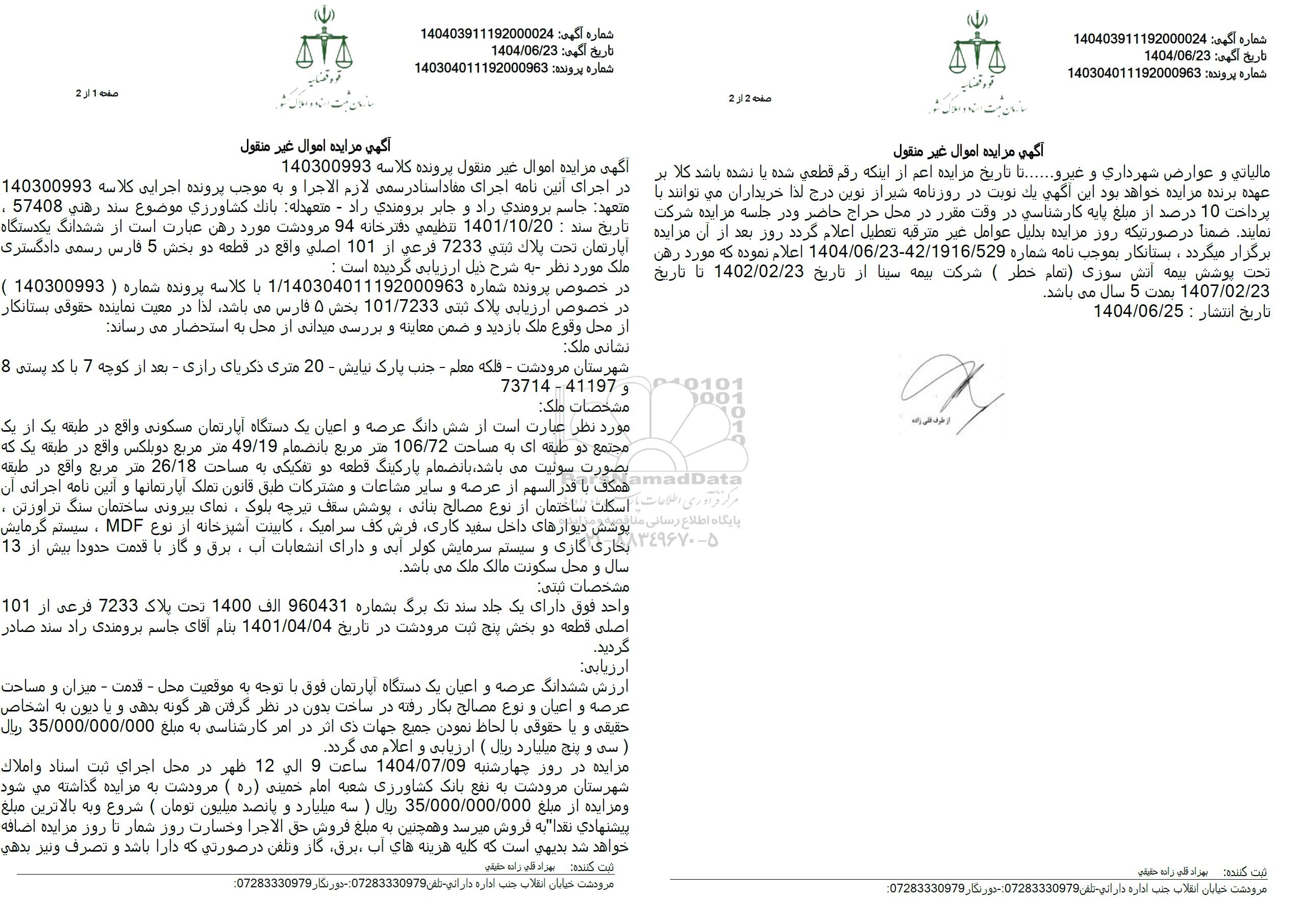 موضوع مزایده : ششدانگ یک دستگاه آپارتمان تحت پلاک ثبتی 7233 فرعی از 101 اصلی واقع در قطعه دو بخش 5 فارس به مساحت 106.72 متر مربع به ارزش 35.000.000.000 ریال