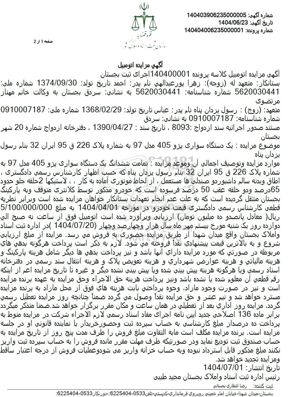 مزایده فروش یک دستگاه سواری پژو 405 مدل 97