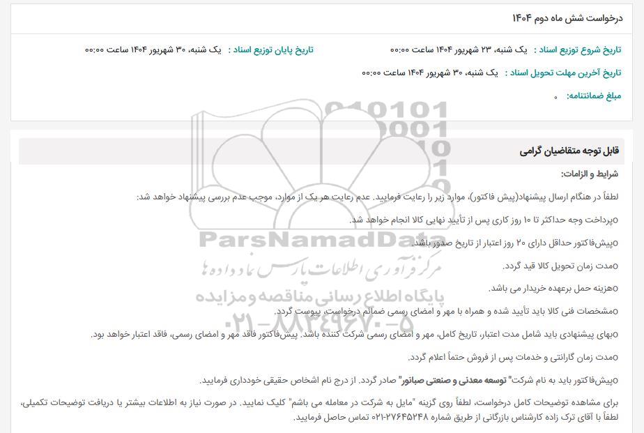 استعلام بها و موضوع استعلام استعلام درخواست شش ماه دوم 1404 به اطلاع کلیه شرکتها و افراد متخصص واجد شرایط میرساند، آگهی گذار در نظر دارد از طریق استعلام بها، نسبت به انتخاب و دریافت پیشنهادات اقدام نماید. این استعلام با کد آگهی ثبت شده در سامانه خبرگزاری پارس نماد : 9551564 منتشر شده است. مشخصات استعلام : تاریخ شروع استعلام: 1404/06/24 آخرین مهلت ارسال پیشنهاد قیمت : 1404/06/30 و محل اجرای پروژه : استان سایر میباشد. استعلام قیمت مورد درخواست : استعلام درخواست شش ماه دوم 1404 با دستهبندیهای تخصصی و گروه های مرتبط : مواد معدنی, مواد اولیه کارخانجات, تجهیزات و ماشین آلات صنعتی, تجهیزات و ماشین آلات حفاری, استعلام اطلاع رسانی میگردد. شرایط شرکت در استعلام آنلاین : ابتدا ثبت نام در سامانه استعلام پارس نماد و تکمیل مدارک موردنیاز و بارگذاری در سامانه رعایت تمامی ضوابط و الزامات مندرج در اسناد استعلام است.
