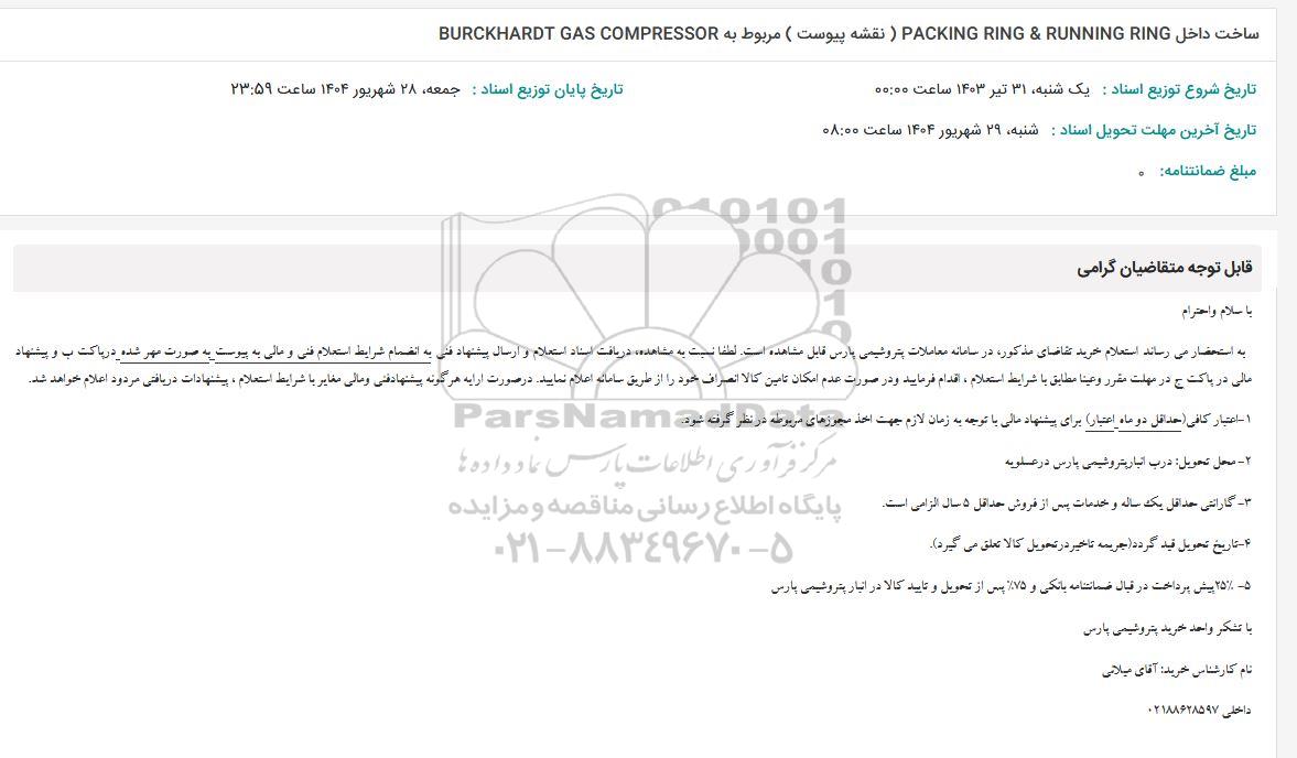 به استحضار می رساند استعلام خرید تقاضای مذکور در سامانه معاملات پتروشیمی پارس قابل مشاهده است. لطفا نسبت به مشاهده دریافت استاد استعلام و ارسال پیشنهاد فنی به انضمام شرایط استعلام فنی و مالی به پیوست به صورت مهر شده در پاکت به و پیشنهاد مالی در پاکت ج در مهلت مقرر وعينا مطابق با شرایط استعلام ، اقدام فرمایید و در صورت عدم امکان تامین کالا انصراف خود را از طریق سامانه اعلام نمایید. در صورت ارایه هر گونه پیشنها دفنی و مالی مغایر با شرایط استعلام ، پیشنهادات دریافتی مردود اعلام خواهد شد.