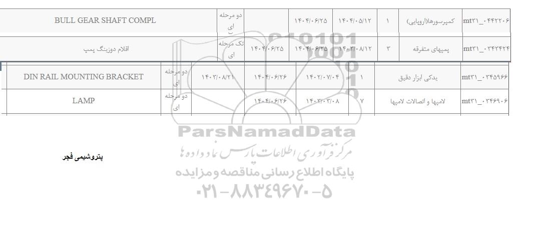| mt31-0343424 | پمپهای متفرقه | 3 | 1404.6.25 | تک مرحله ای | اقلام دوزینگ پمپ |
