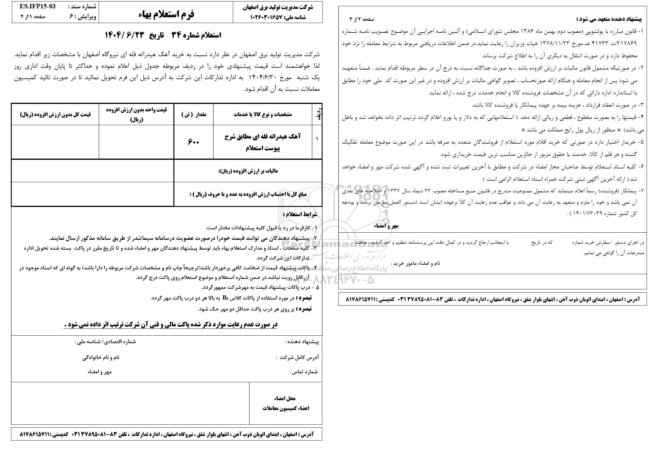 استعلام شماره 34 - تاریخ 1404.06.23
