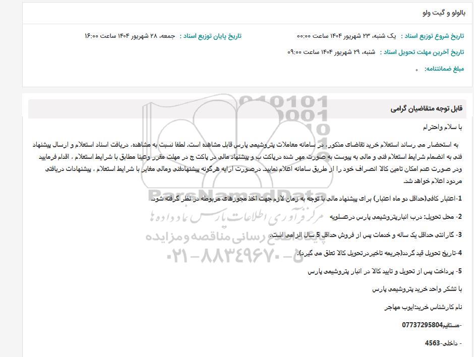 به استحضار میرساند استعلام خرید تقاضای مذکور در سامانه معاملات پتروشیمی پارس قابل مشاهده است. لطفا نسبت به مشاهده دریافت اسناد استعلام و ارسال پیشنهاد فنی به انضمام شرایط استعلام فنی و مالی به پیوست به صورت مهر شده در پاکت ب و پیشنهاد مالی در پاکت ج در مهلت مقرر و عينا مطابق با شرایط استعلام ، اقدام فرمایید و در صورت عدم امکان تامین کالا انصراف خود را از طریق سامانه اعلام نمایید در صورت ارایه هرگونه پیشنهاد فنی و مالی مغایر با شرایط استعلام ، پیشنهادات دریافتی مردود اعلام خواهد شد.