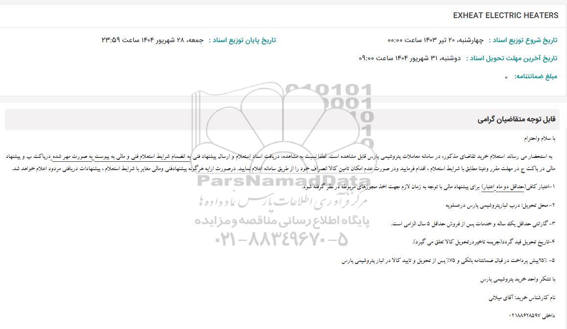 به استحضار میرساند استعلام خرید تقاضای مذکور در سامانه معاملات پتروشیمی پارس قابل مشاهده است. لطفا نسبت به مشاهده دریافت اسناد استعلام و ارسال پیشنهاد فنی به انضمام شرایط استعلام فنی و مالی به پیوست به صورت مهر شده دریاکت ب و پیشنهاد مالی در پاکت ج در مهلت مقرر وعینا مطابق با شرایط استعلام، اقدام فرمایید و در صورت عدم امکان تامین کالا انصراف خود را از طریق سامانه اعلام نمایید. در صورت ارایه هرگونه پیشنهادفنی و مالی مغایر با شرایط استعلام ، پیشنهادات دریافتی مردود اعلام خواهد شد.