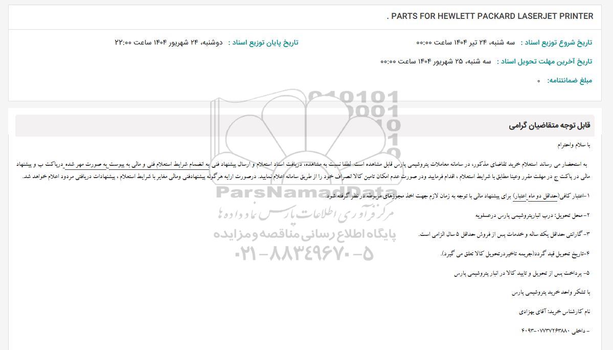 تاریخ پایان توزیع اسناد : دوشنبه 24 شهریور 1404 ساعت 22:00