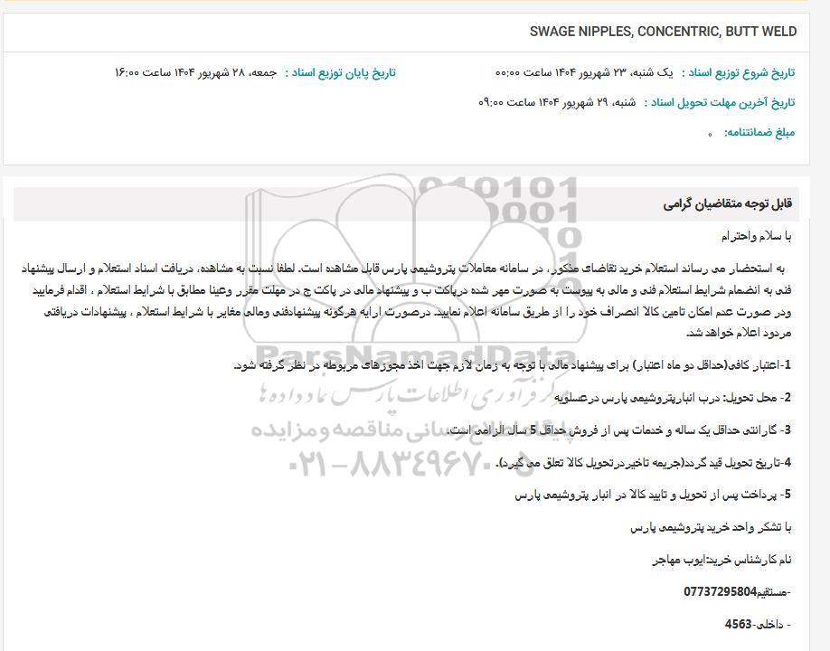 استعلام بها و موضوع استعلام استعلام SWAGE NIPPLES, CONCENTRIC, BUTT WELD به اطلاع کلیه شرکتها و افراد متخصص واجد شرایط میرساند، آگهی گذار در نظر دارد از طریق استعلام بها، نسبت به انتخاب و دریافت پیشنهادات اقدام نماید. این استعلام با کد آگهی ثبت شده در سامانه خبرگزاری پارس نماد : 9551592 منتشر شده است. مشخصات استعلام : تاریخ شروع استعلام: 1404/06/24 آخرین مهلت ارسال پیشنهاد قیمت : 1404/06/28 و محل اجرای پروژه : استان بوشهر میباشد. استعلام قیمت مورد درخواست : استعلام SWAGE NIPPLES, CONCENTRIC, BUTT WELD با دستهبندیهای تخصصی و گروه های مرتبط : لوله و اتصالات, لوله های فولادی و چدنی, تجهیزات نفت و گاز, استعلام اطلاع رسانی میگردد. شرایط شرکت در استعلام آنلاین : ابتدا ثبت نام در سامانه استعلام پارس نماد و تکمیل مدارک موردنیاز و بارگذاری در سامانه رعایت تمامی ضوابط و الزامات مندرج در اسناد استعلام است.