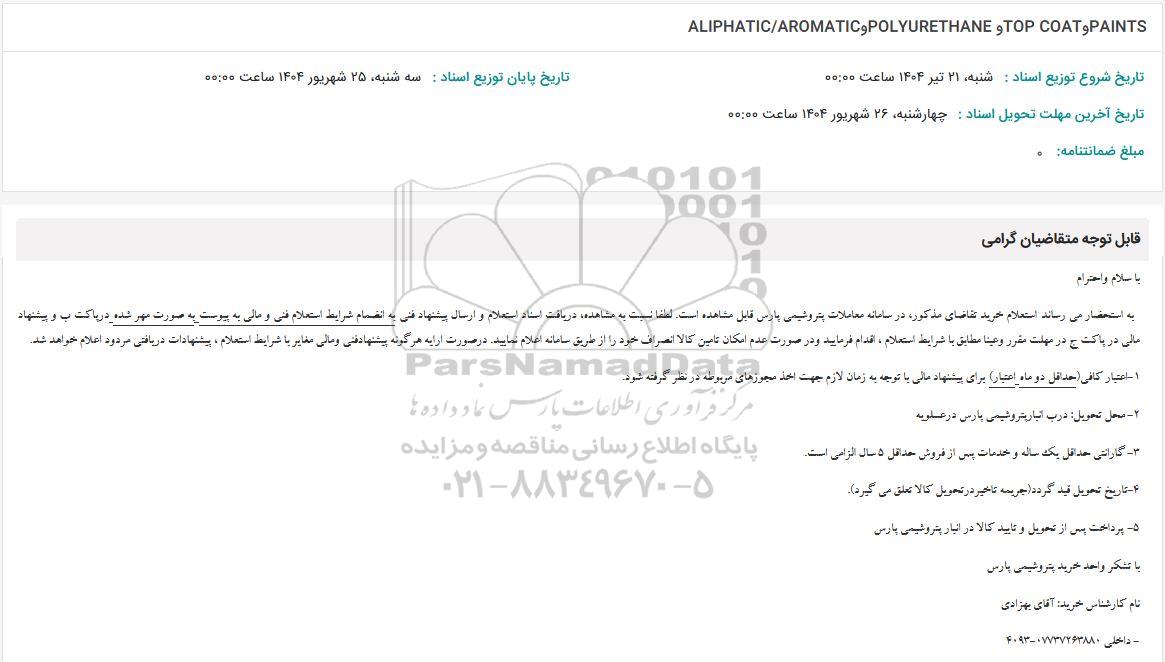 استعلام بها و موضوع استعلام استعلام PAINTS و TOP COAT و POLYURETHANE و ALIPHATIC/AROMATIC به اطلاع کلیه شرکتها و افراد متخصص واجد شرایط میرساند، آگهی گذار در نظر دارد از طریق استعلام بها، نسبت به انتخاب و دریافت پیشنهادات اقدام نماید. این استعلام با کد آگهی ثبت شده در سامانه خبرگزاری پارس نماد : 9551603 منتشر شده است. مشخصات استعلام : تاریخ شروع استعلام: 1404/06/24 آخرین مهلت ارسال پیشنهاد قیمت : 1404/06/25 و محل اجرای پروژه : استان بوشهر میباشد. استعلام قیمت مورد درخواست : استعلام PAINTS و TOP COAT و POLYURETHANE و ALIPHATIC/AROMATIC با دستهبندیهای تخصصی و گروه های مرتبط : انواع پوشش پلیمری، اپکسی، عایق کاری صنعتی, صنایع رنگ،رزین و چسب, مواد شیمیایی, مواد اولیه کارخانجات, استعلام اطلاع رسانی میگردد. شرایط شرکت در استعلام آنلاین : ابتدا ثبت نام در سامانه استعلام پارس نماد و تکمیل مدارک موردنیاز و بارگذاری در سامانه رعایت تمامی ضوابط و الزامات مندرج در اسناد استعلام است.